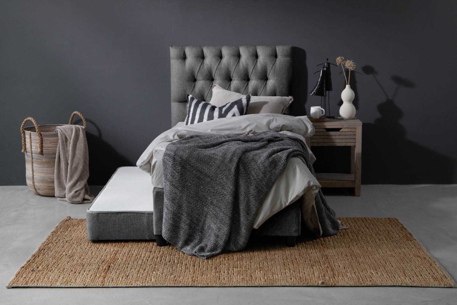 The Skyler stands out for its useful pull-out bed or 'trundle' that fits snuggly within its luxe frame. This extra or second pull-out bed contains a high-density foam mattress, upholstered in matching high-quality fabric.