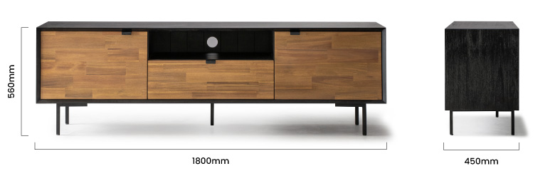 The Dawson TV Stand features spacious storage with two cabinets and an open shelf, perfect for organising media devices and accessories. Its sturdy construction ensures lasting quality, making it an ideal centrepiece for modern living rooms.