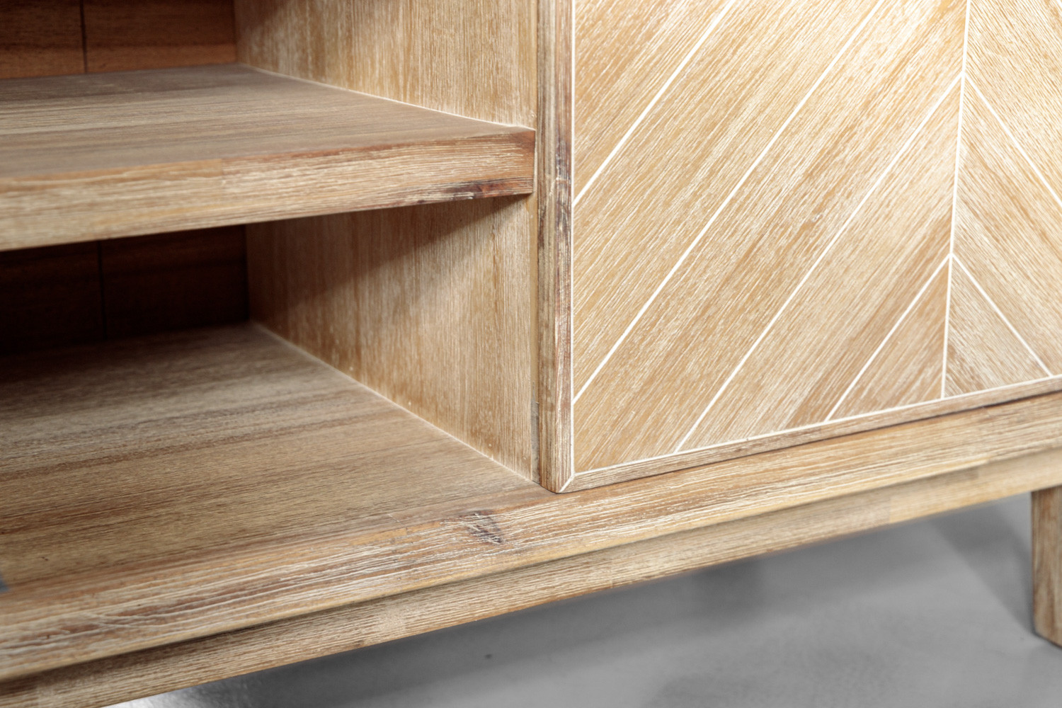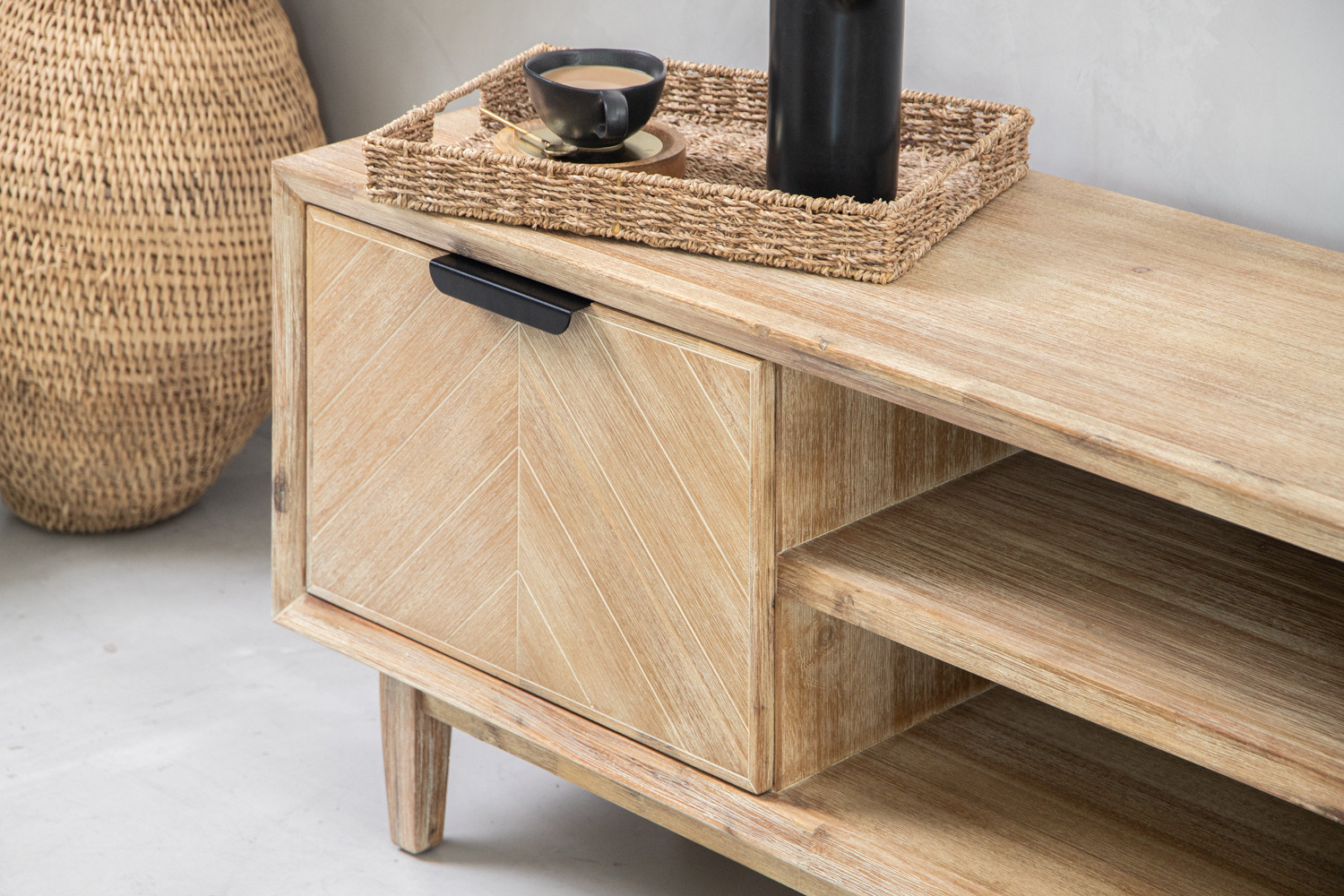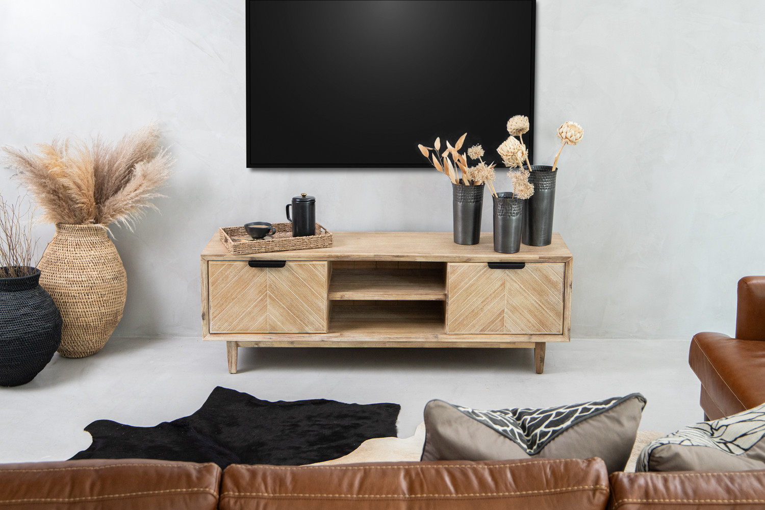Beauty meets utility in the McKenna TV Stand, where spacious cabinet shelves and sleek black handles provide organised storage. Acacia wood and Acacia wood veneers works with a classic chevron pattern to beautify your living room.