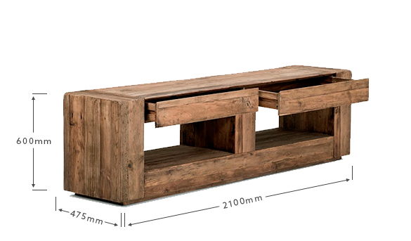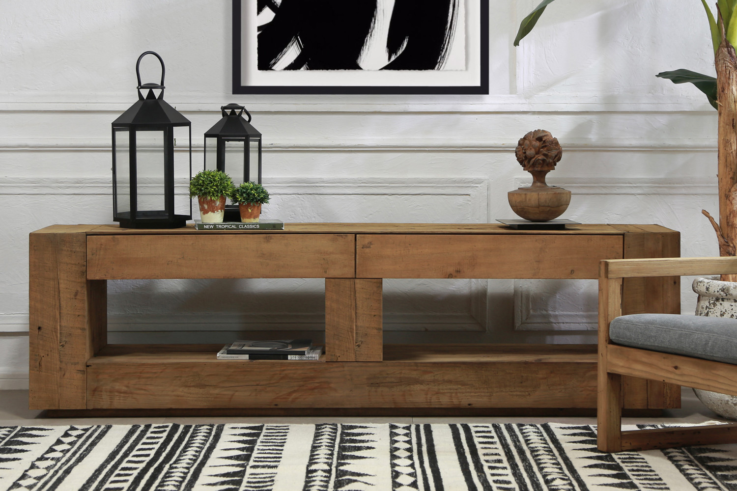 Rustic yet refined, the Volantis TV Stand combines solid character and warmth with a touch of exotic flavour that will both ground and define your space. Beautifully crafted from sustainable reclaimed pine with a rustic finish, this symmetrically designed unit offers generous display and storage space with two large drawers and as well as two versatile open consoles. An impressive addition to complement any rustic, eclectic or contemporary style space.