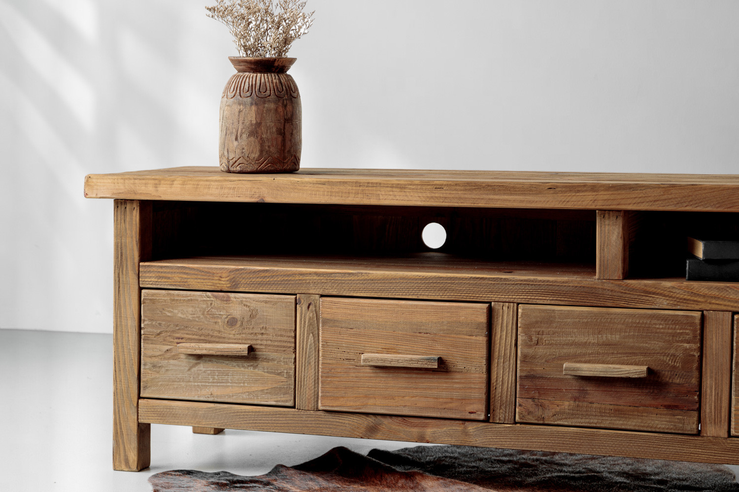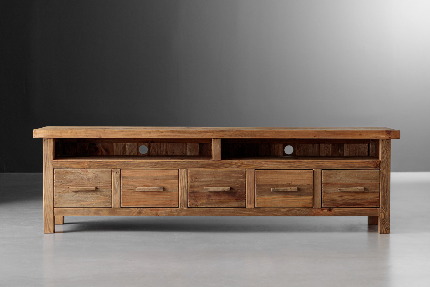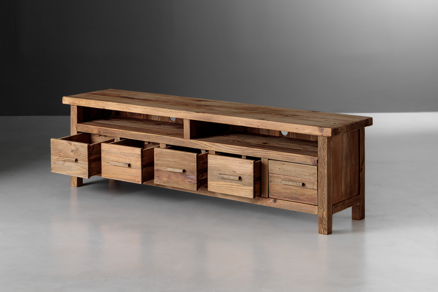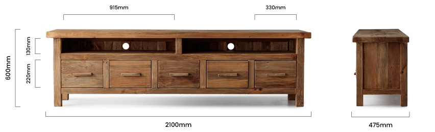 Enhance your living room with the Volturi TV Stand, a perfect blend of classic design and modern functionality. Crafted from solid reclaimed pine, this eco-friendly piece offers five spacious drawers and two open shelves, providing ample storage for your media devices and accessories. The natural wood finish adds a warm, rustic charm, while its sturdy construction ensures durability. The Volturi is not just a storage solution—it's a stylish addition to any living space, combining aesthetic appeal with practical design.