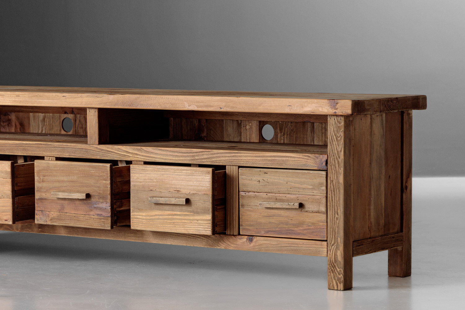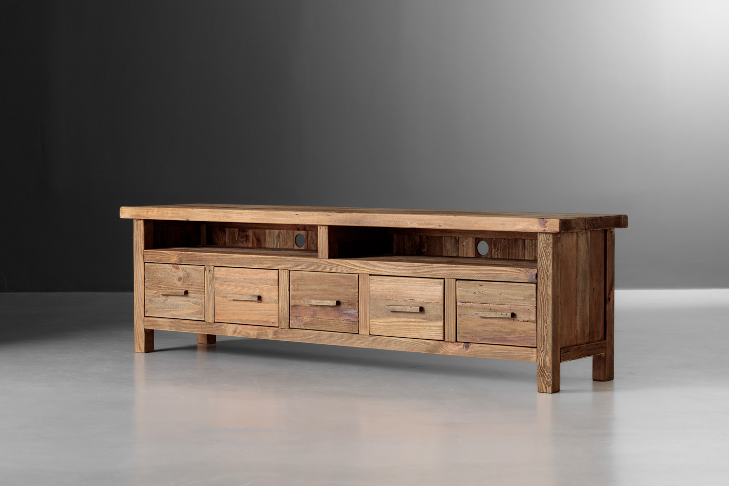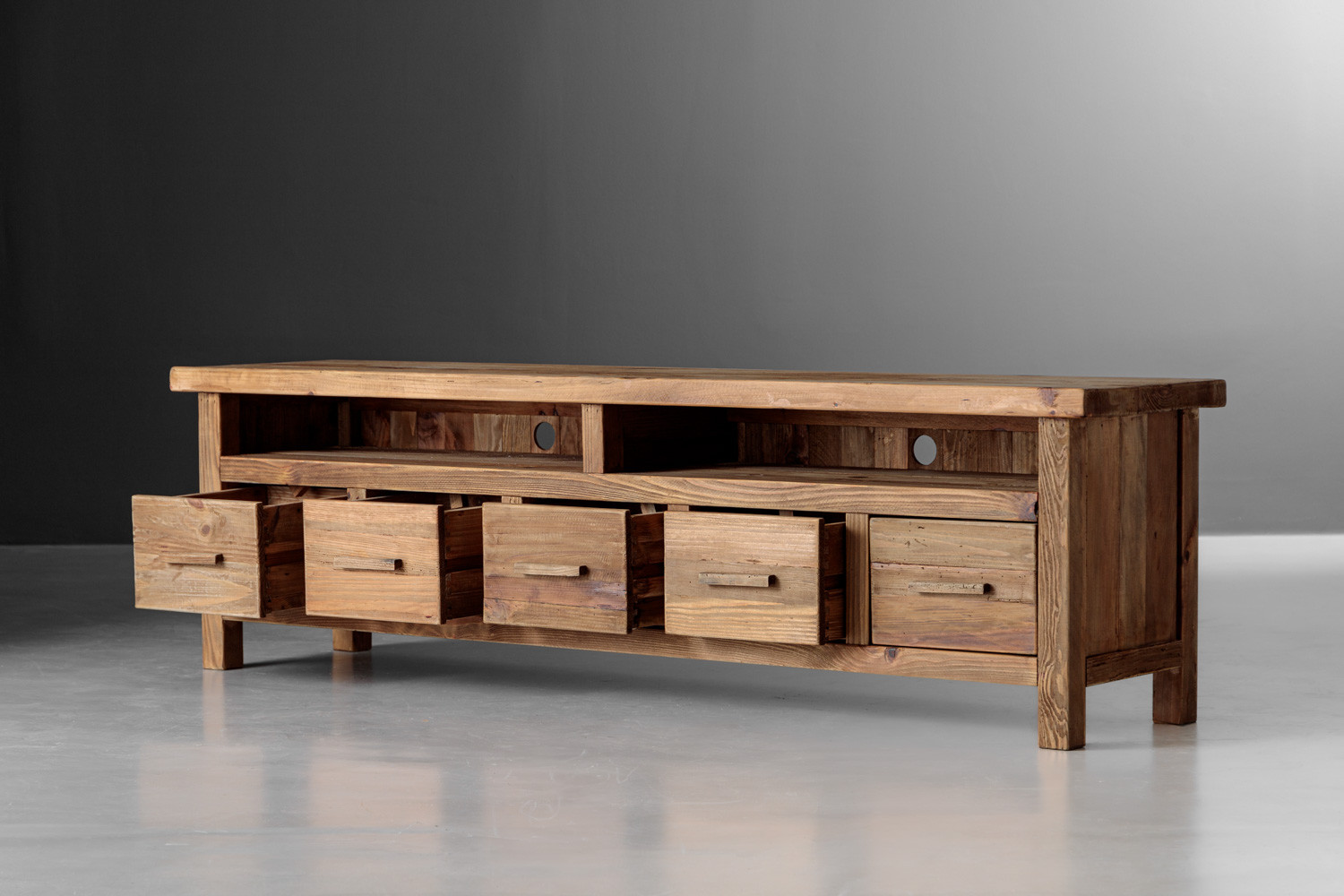 Enhance your living room with the Volturi TV Stand, a perfect blend of classic design and modern functionality. Crafted from solid reclaimed pine, this eco-friendly piece offers five spacious drawers and two open shelves, providing ample storage for your media devices and accessories. The natural wood finish adds a warm, rustic charm, while its sturdy construction ensures durability. The Volturi is not just a storage solution—it's a stylish addition to any living space, combining aesthetic appeal with practical design.