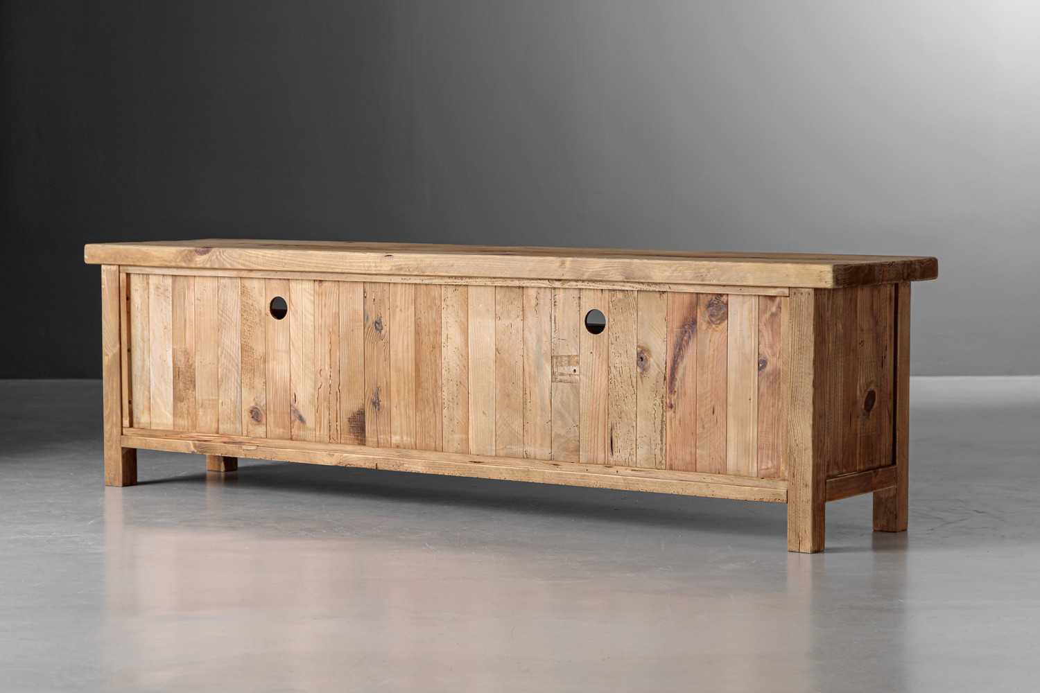 The Volturi TV Stand is a remarkable piece that brings together the best of timeless design and contemporary functionality. Made from solid reclaimed pine, this TV stand not only adds an eco-friendly touch to your home but also embodies the charm of natural, rustic wood. Each piece of pine used in the construction of the Volturi has its own unique character, with variations in grain and texture that tell a story of sustainability and craftsmanship.